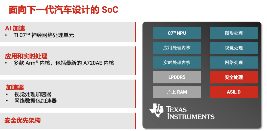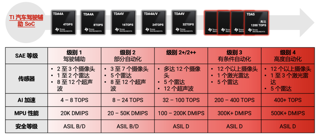在规划层面,TI 的核心决策是 TDA5 高性能 SoC 系列,面向 L1 至 L3 全级别自动驾驶设想,强调功耗、安全与 AI 算力的协同优化,TDA5是通过加多TOPS来罢了我方的跳动,毕竟TDA4V的算力不太够看。