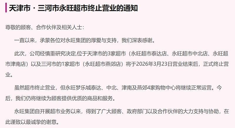 永旺中国近日文书一项伏击业务疗养。把柄永旺(中国)投资有限公司官网及永旺梦乐城各门店公众号发布的见知体育游戏app平台,位于天津的永旺超市泰达店、中北店、津南店以及位于河北三河的燕郊店,将于2026年3月23日营业末端后精采关闭。