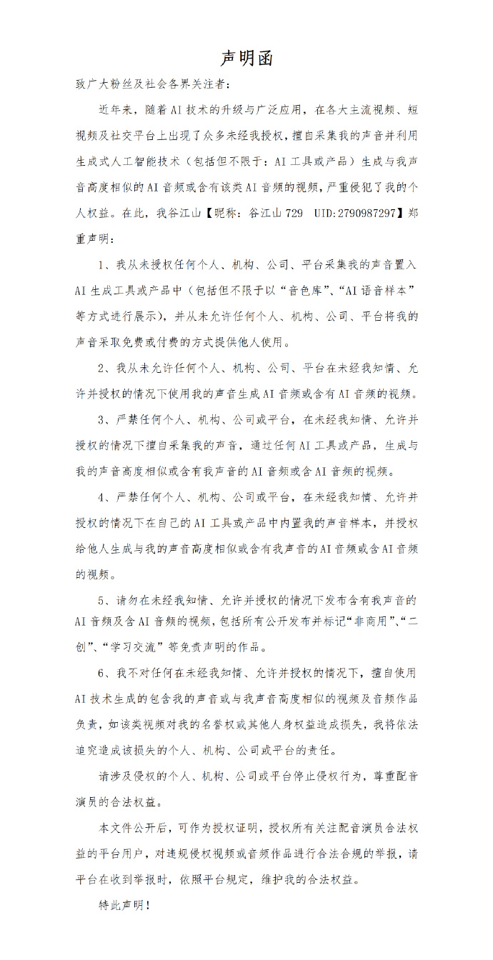 随后多位配音演员发出声明函示意“严禁任何个东说念主、机构、公司或平台,在未经本东说念主知情、允许并授权的情况下在本身的AI用具或居品中内置声息样本。”