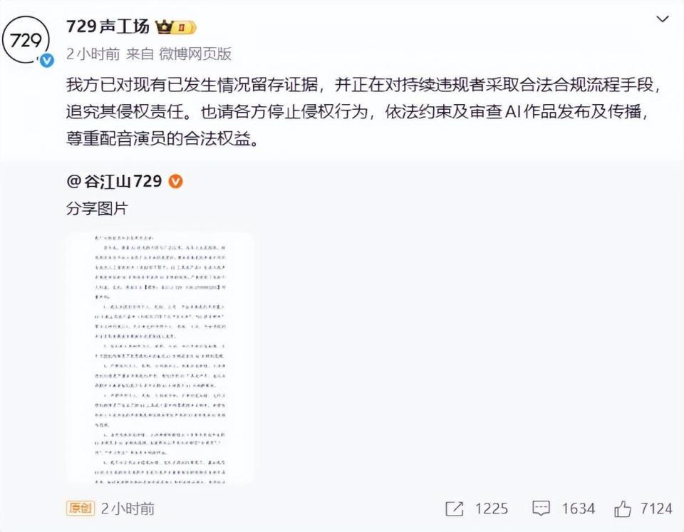 729声工厂发声:本身已对现存已发生情况留存左证,并正在对握续违法者遴荐正当合规经过技能,根究其侵权职守。也请各方罢手侵权行径,照章敛迹及审查AI作品发布及传播,尊重配音演员的正当权利。