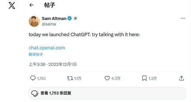 就在这么一个人人集体丧气的深秋,2022年11月30日,OpenAI的CEO山姆·奥特曼(Sam Altman)发了一条推文,轻佻是:嘿,咱们上线了一个叫ChatGPT的东西,你们来玩玩?